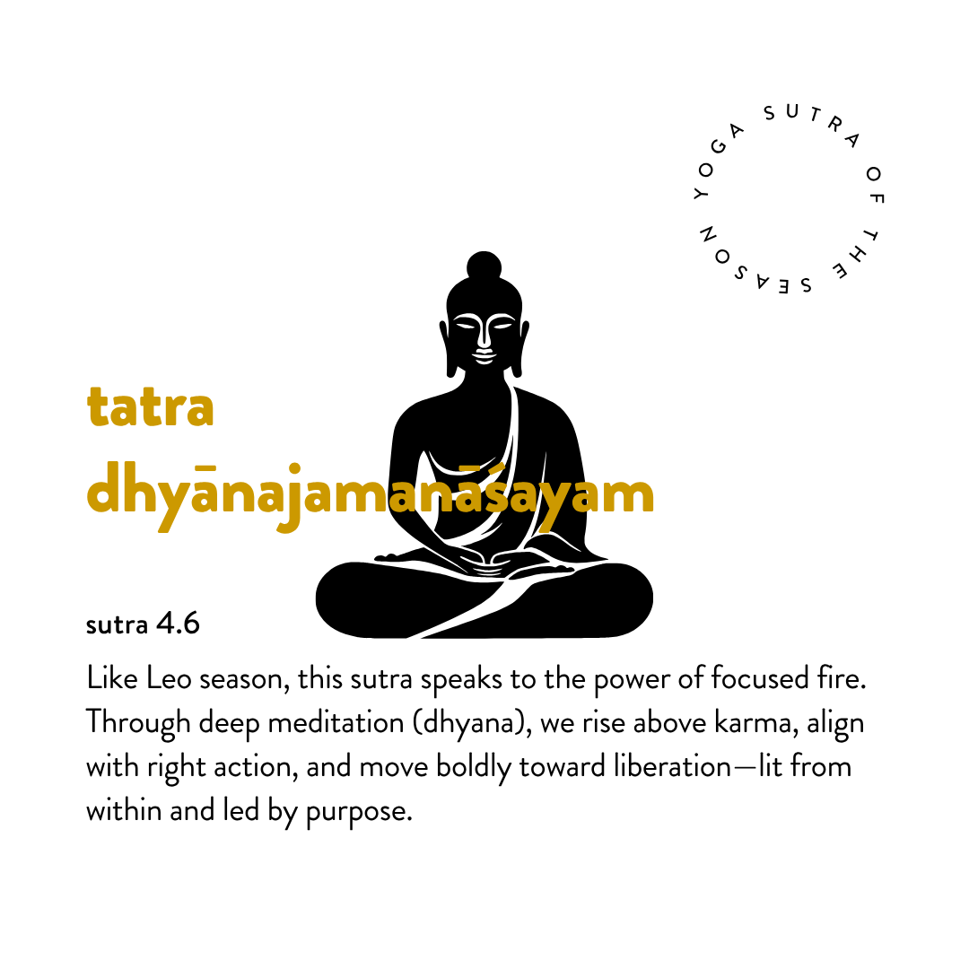 In our "Sutra of the Season," Patanjali reminds us that actions rooted in stillness and clarity don’t leave karmic residue. Through Dhyana—deep meditation—we can part the mental clouds and align with the life-giving power of the sun, Leo’s ruling planet. Rather than charging forward with unchecked “main character energy” (an example of a klesha that plants karmic seeds), we refine our actions with mindfulness and intention. We'll dive deeper into the philosophy later in the article.